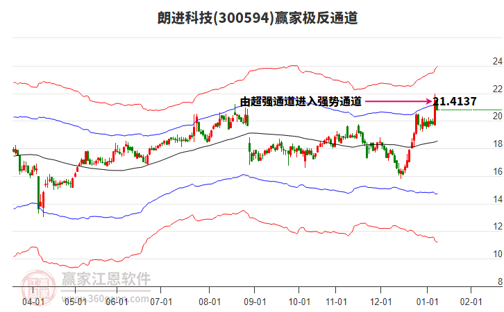 周一300594朗进科技最高价24.75上穿了赢家极反通道工具上方红色外轨线,受到上方红色外轨线强力压制,最终收盘停留在在上方红色外轨线与蓝色外轨线上方的超强通道区域。300594朗进科技近10个交易 详情