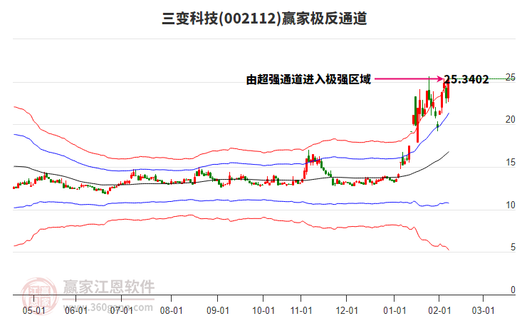 周一三变科技最高价26.5挑战了赢家极反通道工具上方红色外轨线,受到上方红色外轨线强力压制,最终收盘停留在在上方红色外轨线与蓝色外轨线上方的超强通道区域。三变科技近10个交易日涨幅10.1%。 详情