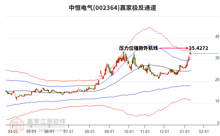 1月14日中恒电气002364最高价36.39上穿了赢家极反通道工具上方红色外轨线,受到上方红色外轨线强力压制,最终收盘停留在在上方红色外轨线与蓝色外轨线上方的超强通道区域。中恒电气002364近10 详情