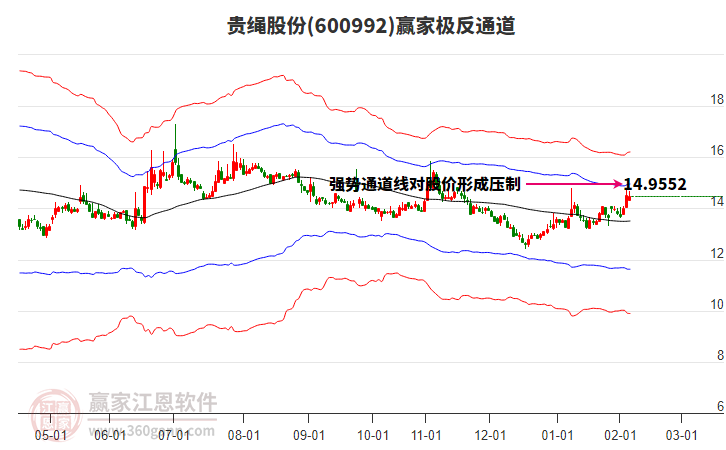 今日600992贵绳股份最高价15.07挑战了赢家极反通道工具蓝色外轨线,受到蓝色外轨线强力压制,最终收盘停留在在蓝色外轨线与生命线上方的强势通道区域。600992贵绳股份近10个交易日涨幅4.33% 详情