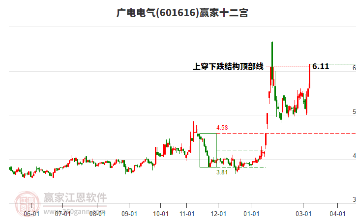 3月6日东山精密最高价98.5挑战了赢家极反通道工具蓝色外轨线,受到蓝色外轨线强力压制,最终收盘停留在在蓝色外轨线与生命线上方的强势通道区域。东山精密近10个交易日涨幅23.35%。 详情
