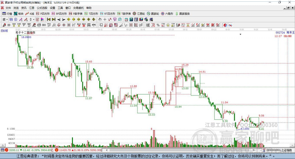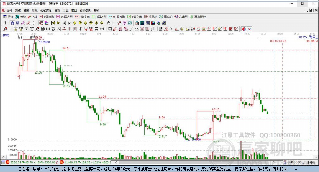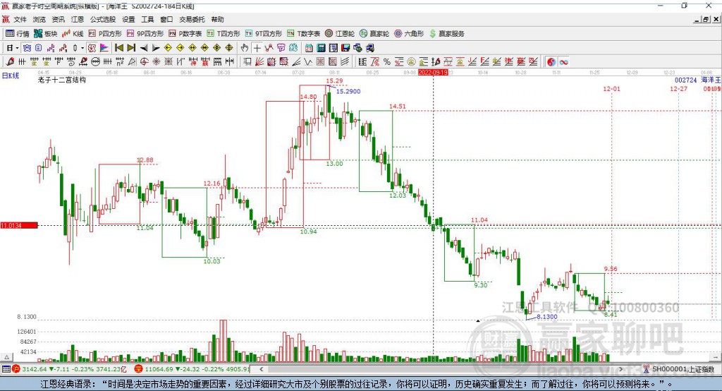 海洋王002724今日股价最高价9.74,最低9.55,今日股价跌幅0.83%,近10个交易日股价呈下跌走向,老子十二宫下跌结构已出现,今天K线下穿前方下跌结构 详情