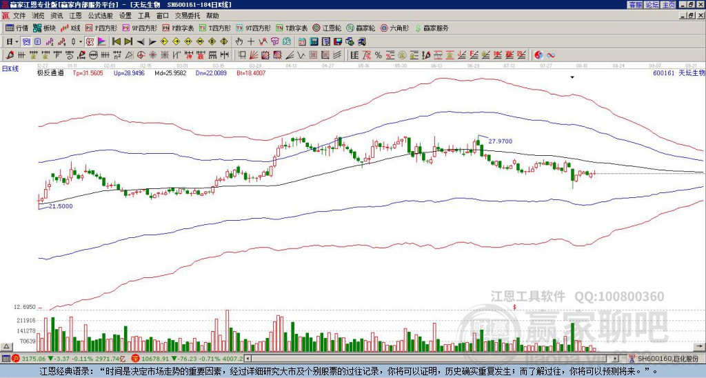 目前天坛生物600161最高价27.68挑战了赢家极反通道工具蓝色外轨线,受到蓝色外轨线强力压制,最终收盘停留在在蓝色外轨线与生命线上方的强势通道区域。天坛生物600161近10个交易日涨幅6.29% 详情